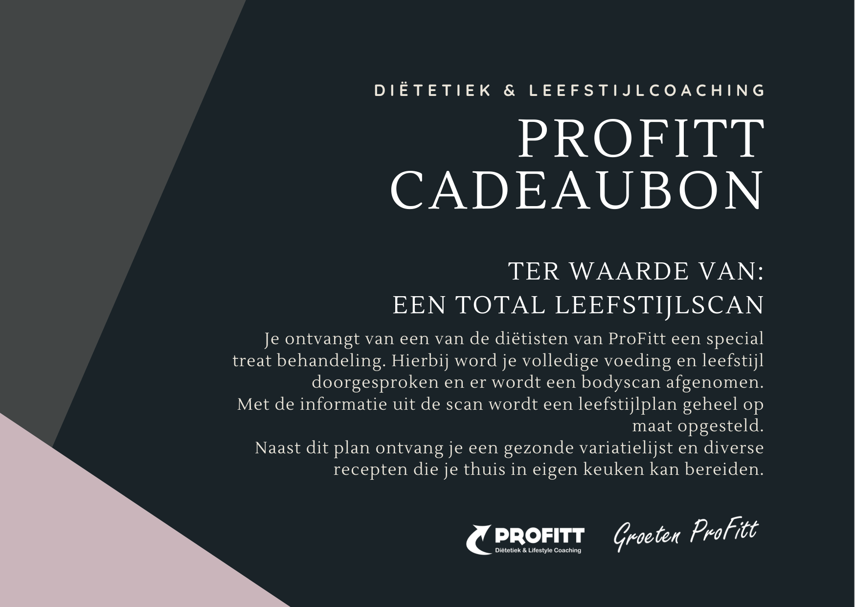 Je ontvangt van een van de diëtisten van ProFitt een special treat behandeling. Hierbij word je volledige voeding en leefstijl doorgesproken en er wordt een bodyscan afgenomen. Met de informatie uit de scan wordt een leefstijlplan geheel op maat opgesteld.